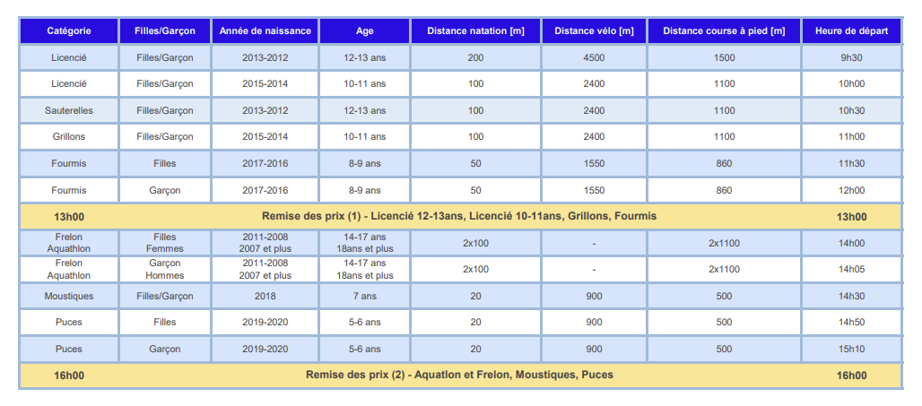 | Le port du casque est obligatoire. Les enfants en catégorie fourmi doivent pouvoir nager 50 mètres sans s'arrêter. Tous les enfants doivent porter un maillot pour le vélo et la course à pied (pas de torse nu). L'assurance est à la charge des participants. Les organisateurs déclinent toute responsabilité en cas d'accident ou de vol. |